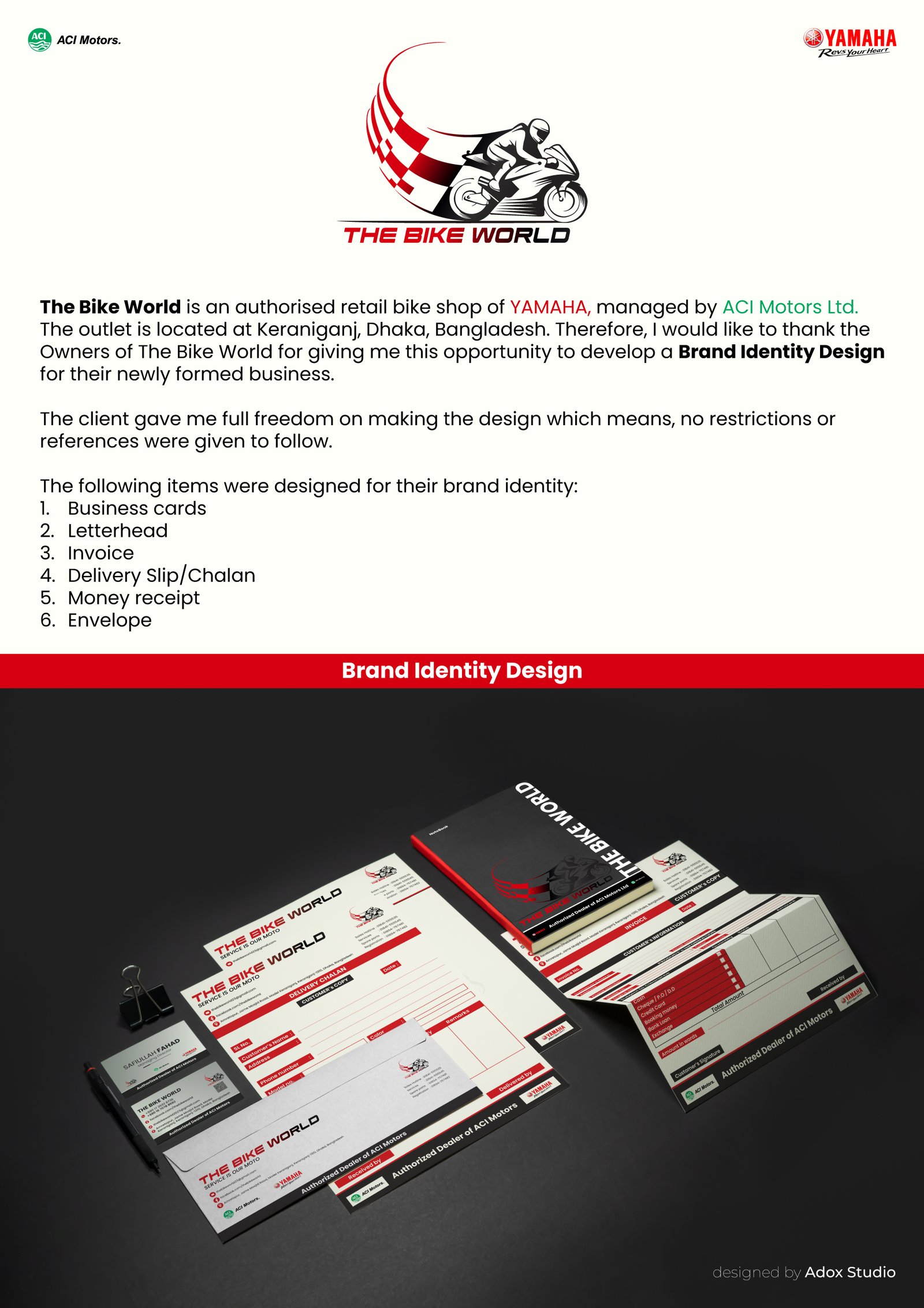 We delivered a complete corporate branding solution that reflects trust, performance, and professionalism. The project included logo design and essential brand stationery such as letterhead, invoices, delivery and money receipts, and business cards. Each element was designed to maintain brand consistency while aligning with Yamaha’s bold and reliable identity across all customer touchpoints.